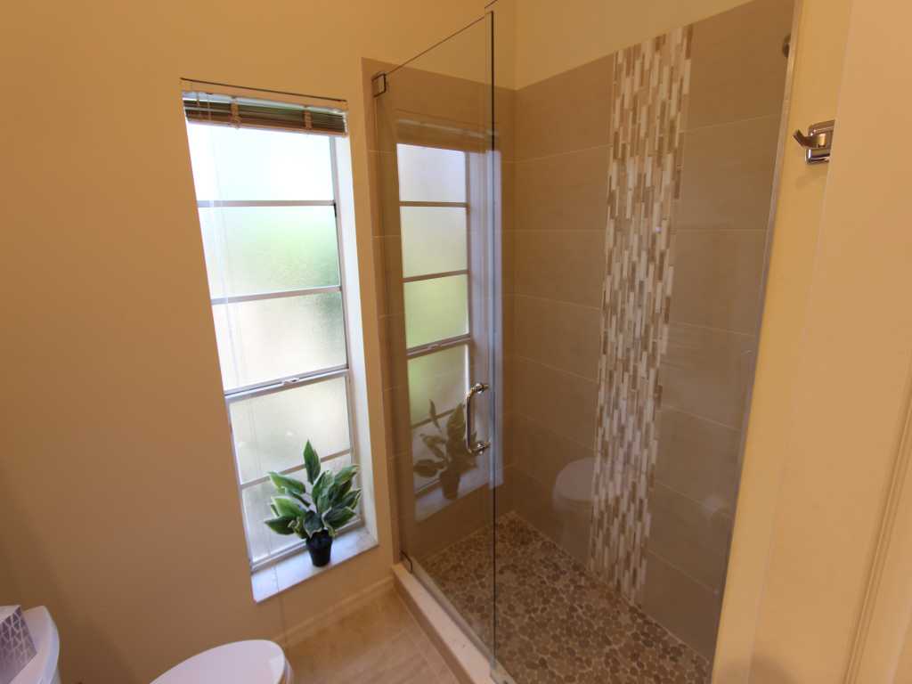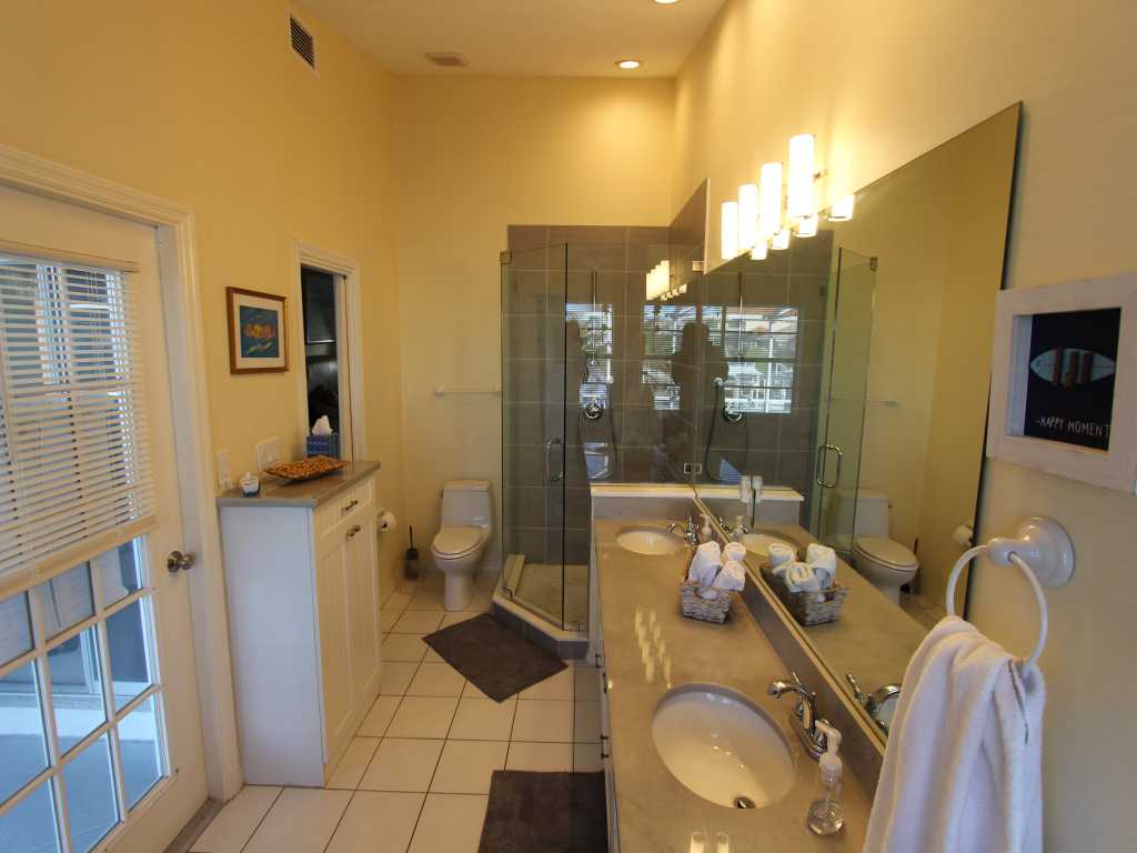 Dusche, Whirlpoolbadewanne, zwei Handwaschbecken, WC, Ausgang zur